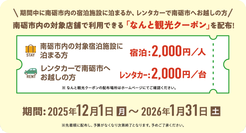 - レンタカーはどこのお店で借りたものでも大丈夫です。対象配布先の受付で車番をお伝えください(※「わ」「れ」ナンバーのみ対象となります)